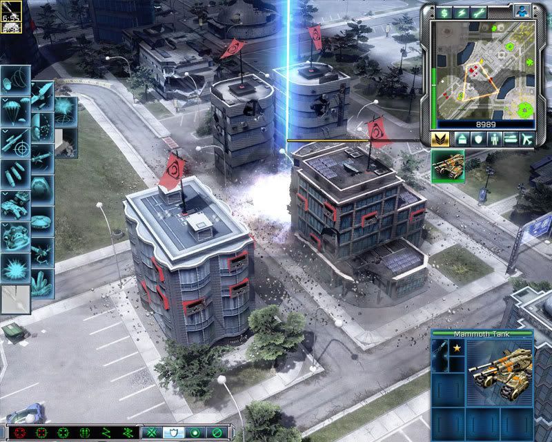 Command & Conquer 3's interface is much, much cleaner by comparison to other C&C games, but retains the classic side-bar feel. Building placement allows for structure rotation, which aids in building a functional base without accidentally clogging things up. Superweapon and special weapon countdowns are handled on the left side of the screen, and many special abilities cost money. This is particularly helpful with regard to airborne APCs - instead of having to build them and write all of them off on a given mission, you can pay $300 per unit you want to fly, one-way.